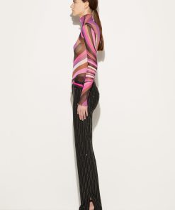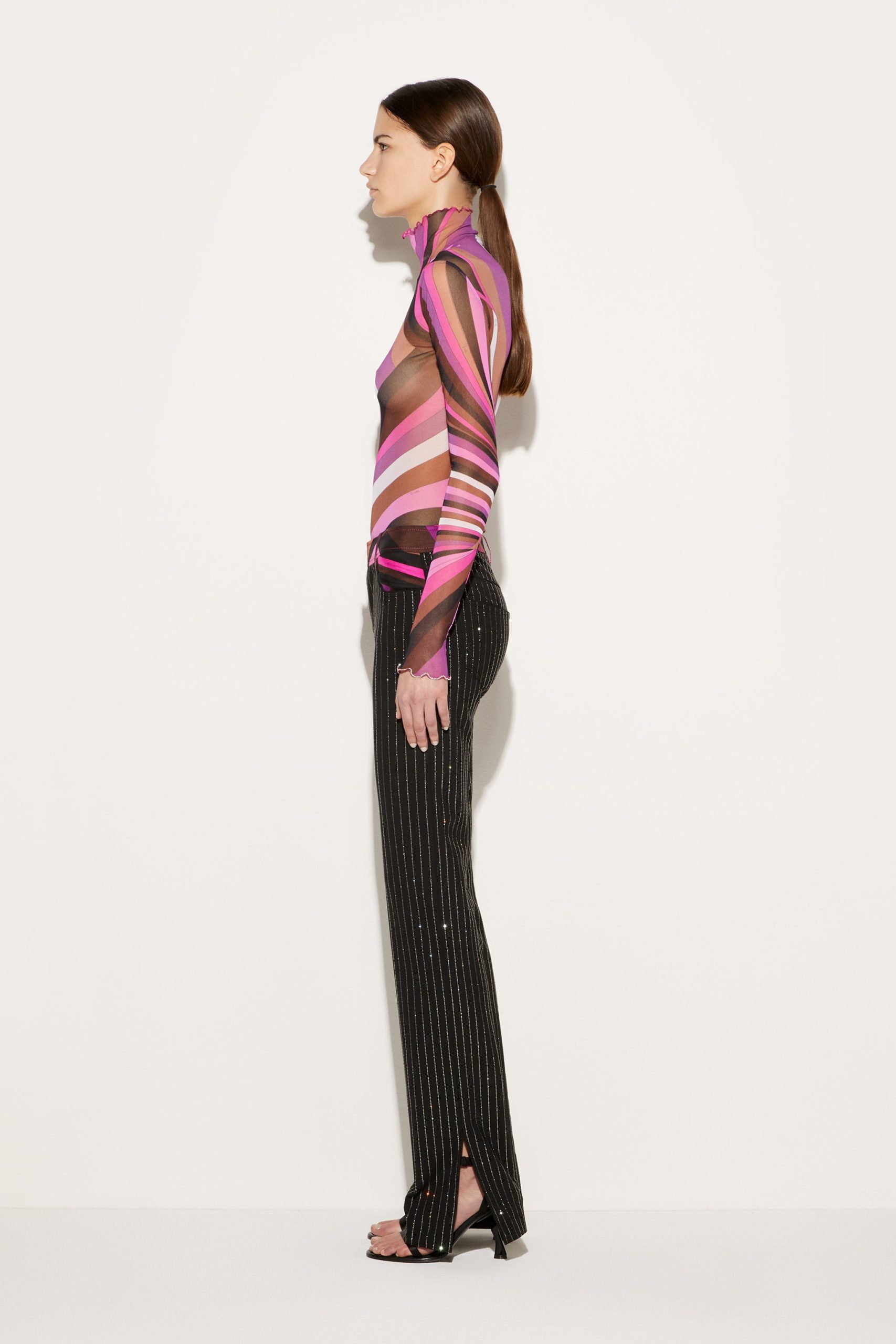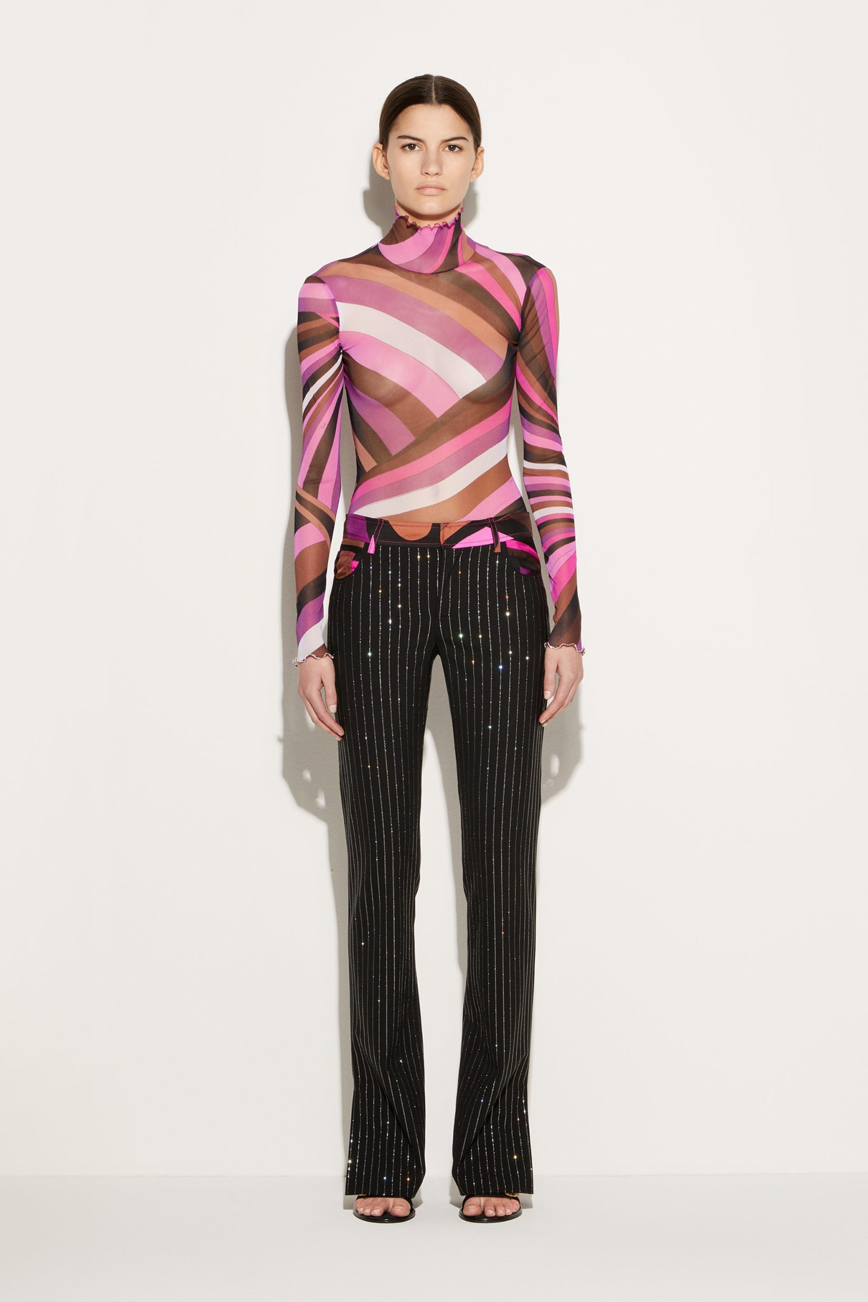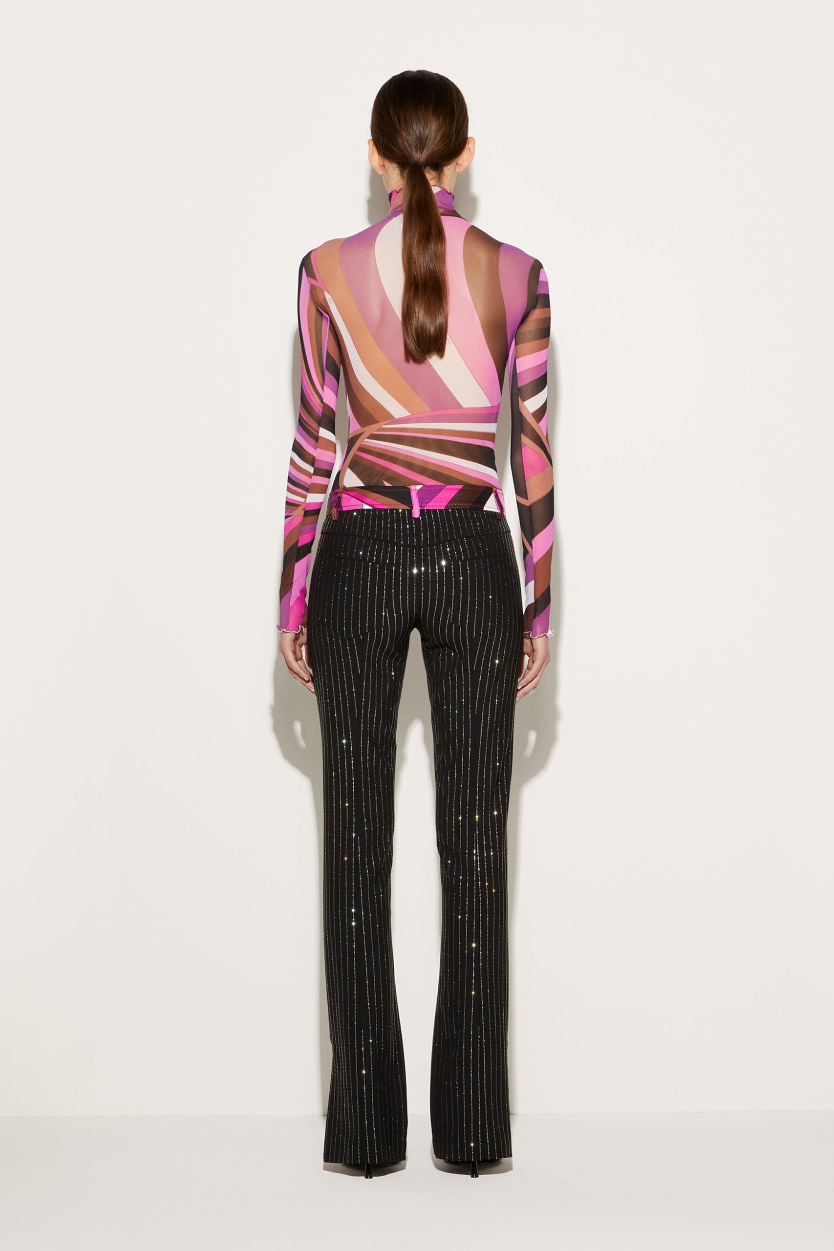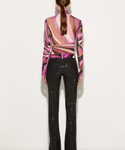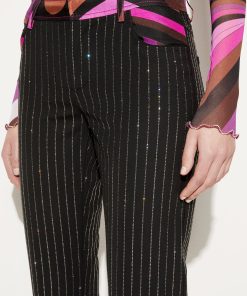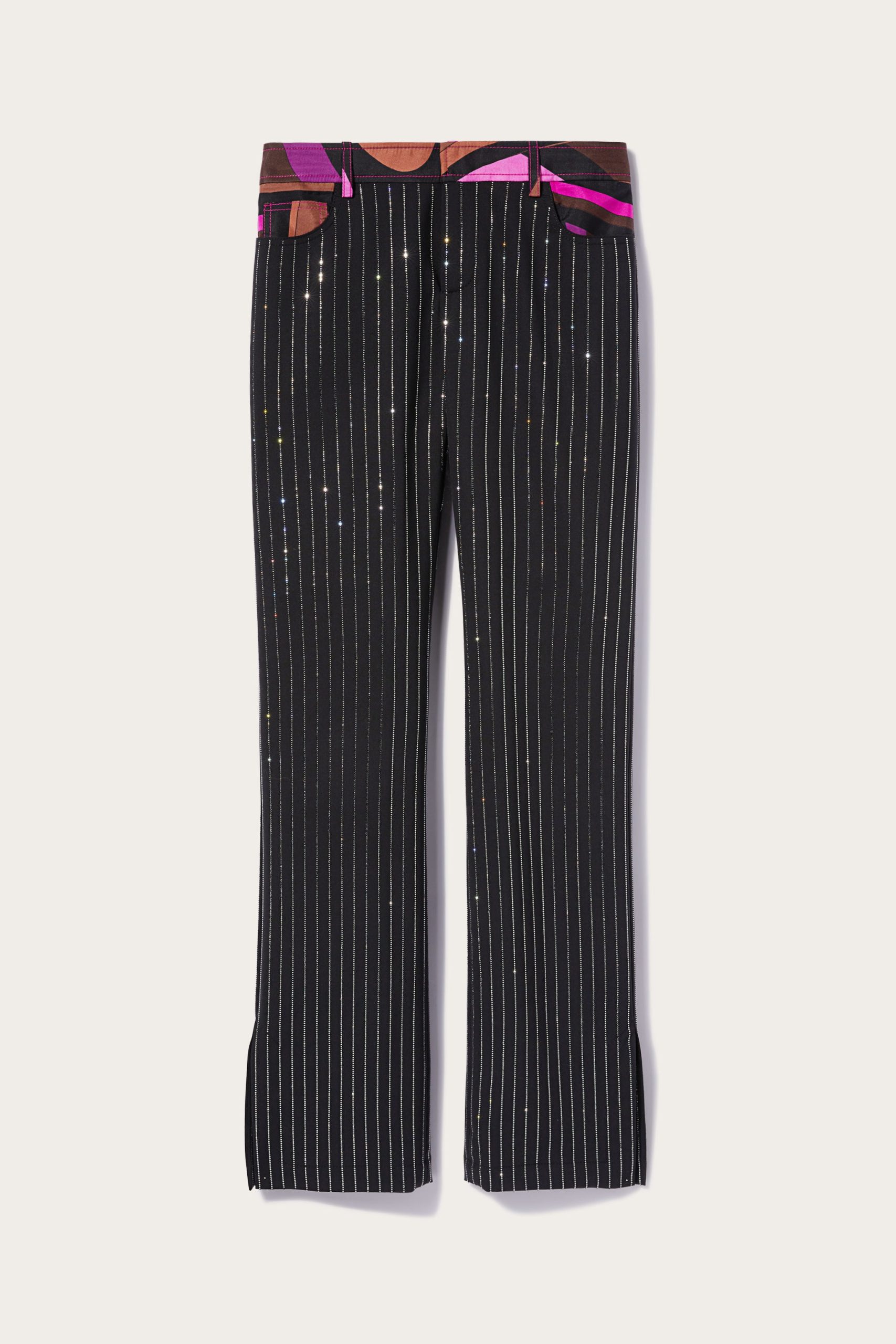 Offering a signature Pucci twist on traditional tailoring, Camille Miceli covers these straight-leg trousers in glittering rhinestone pinstripes. The house’s storied Iride print decorates the waistband and completes the high-octane design.