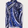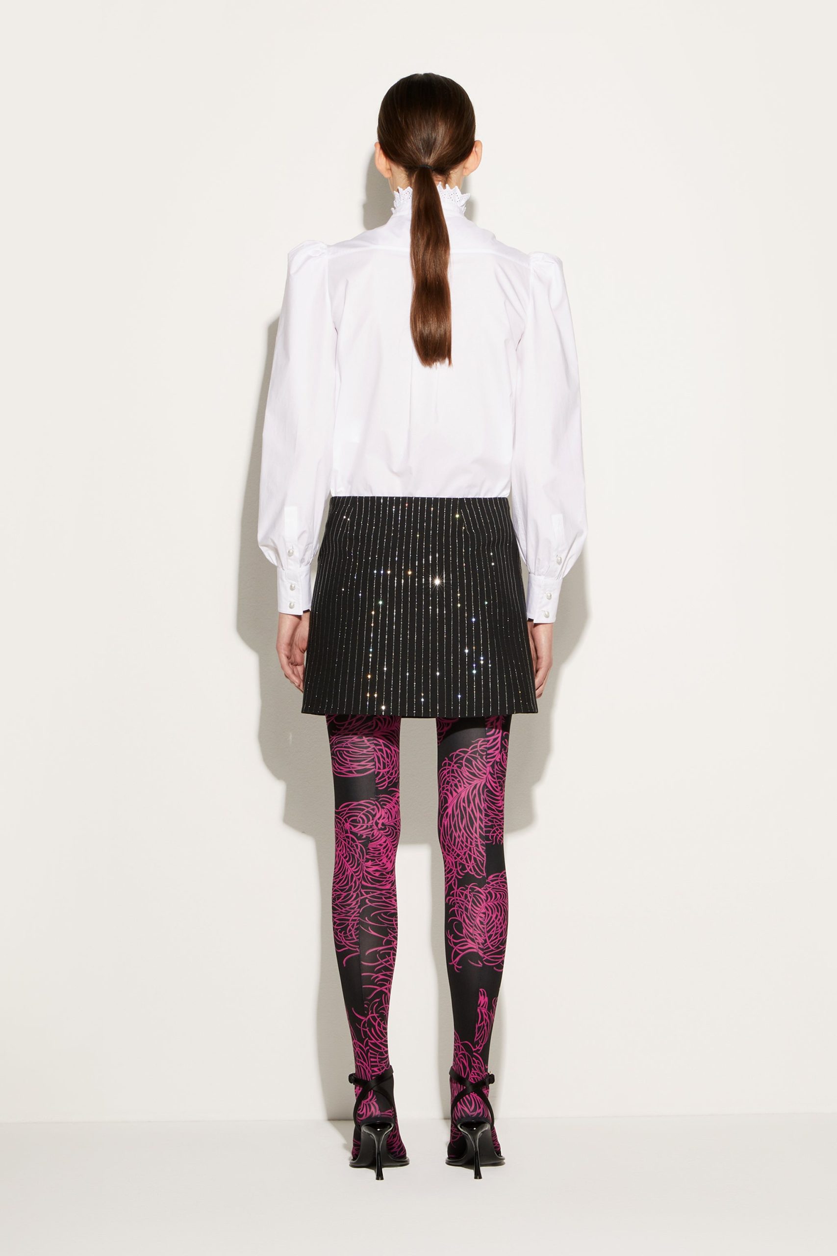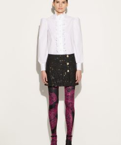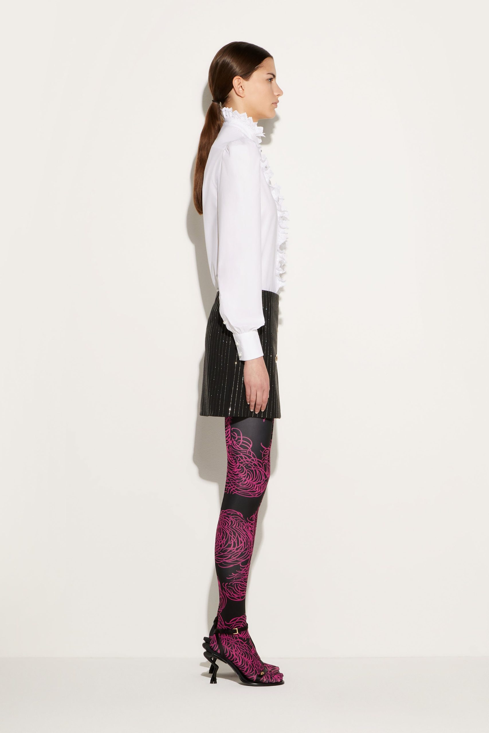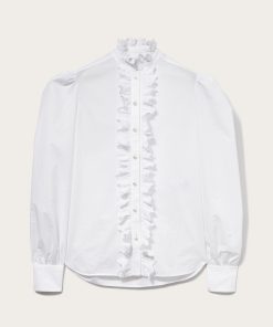 A testament to Pucci’s joyful sensibility, this white shirt is traced with playful broderie anglaise ruffles at the band collar and front fastening. It’s cut from cotton poplin with voluminous puff sleeves that enhance the cheerful mood.