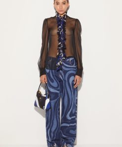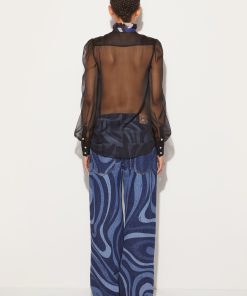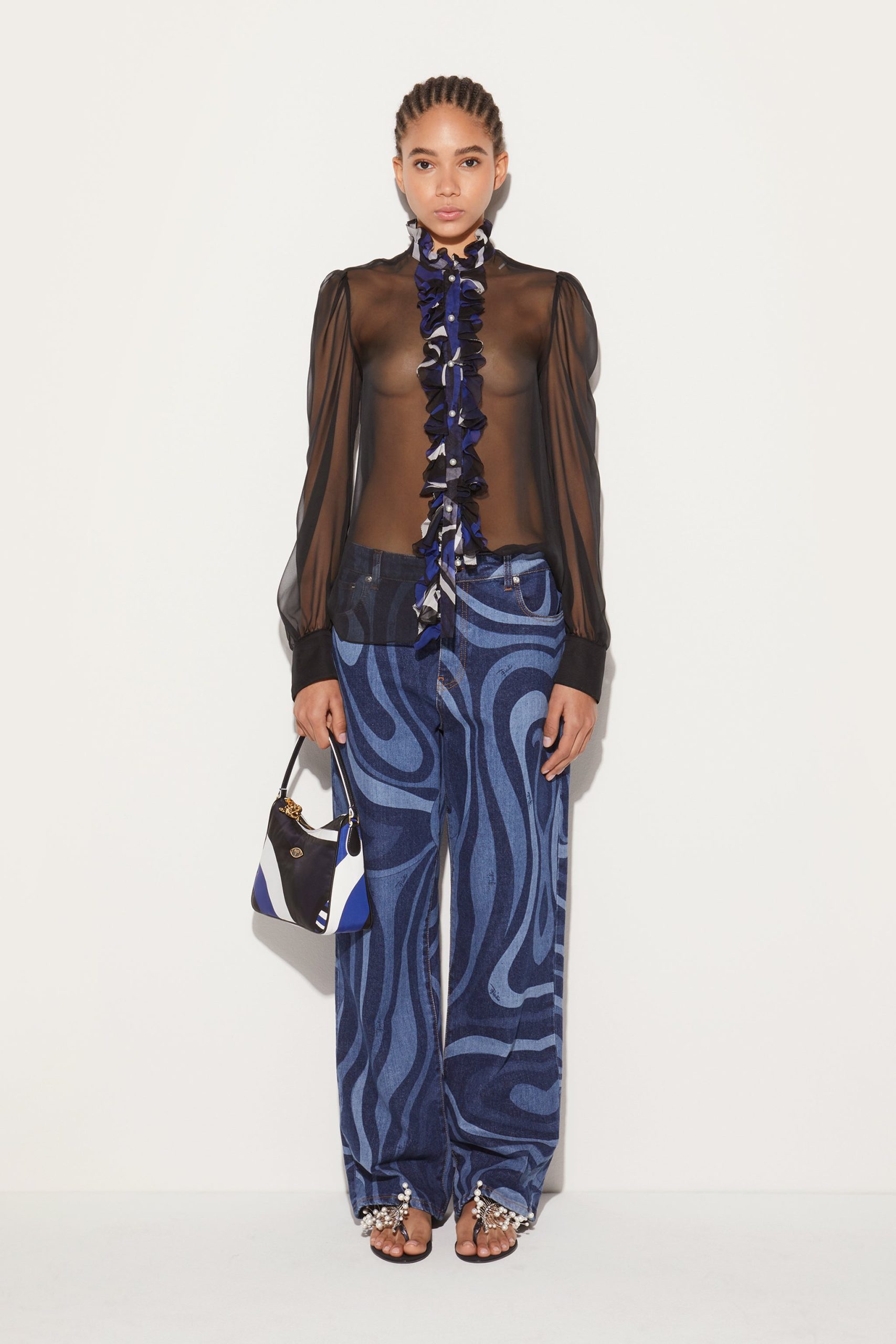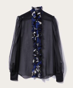 Cascading, Iride-print ruffles invigorate this black shirt, transforming it into a statement piece. It’s cut from semi-sheer silk-chiffon with puffed-up shoulders and buttoned cuffs that enhance the voluminous sleeves.