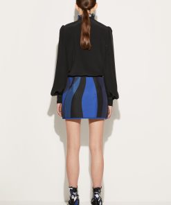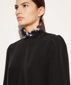 This black top is cut from silk crêpe de chine with gathered shoulders and full bishop-style sleeves. In a classic Pucci twist, the ruffled neck is decorated with the graphic Iride print.