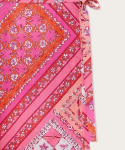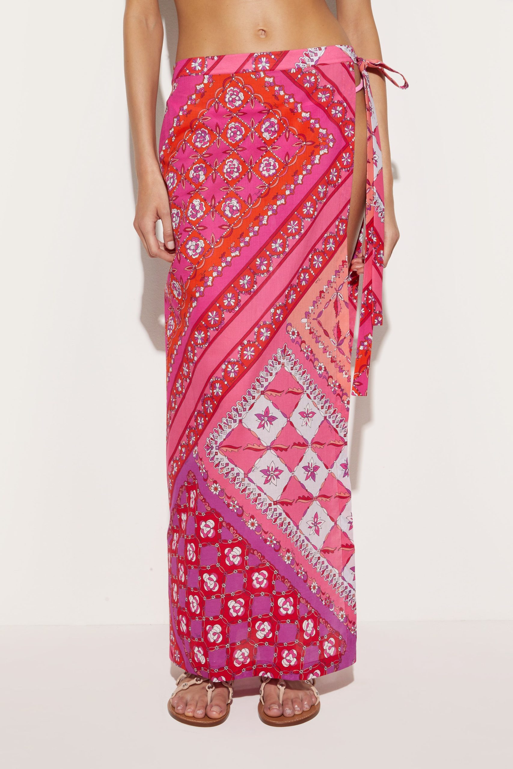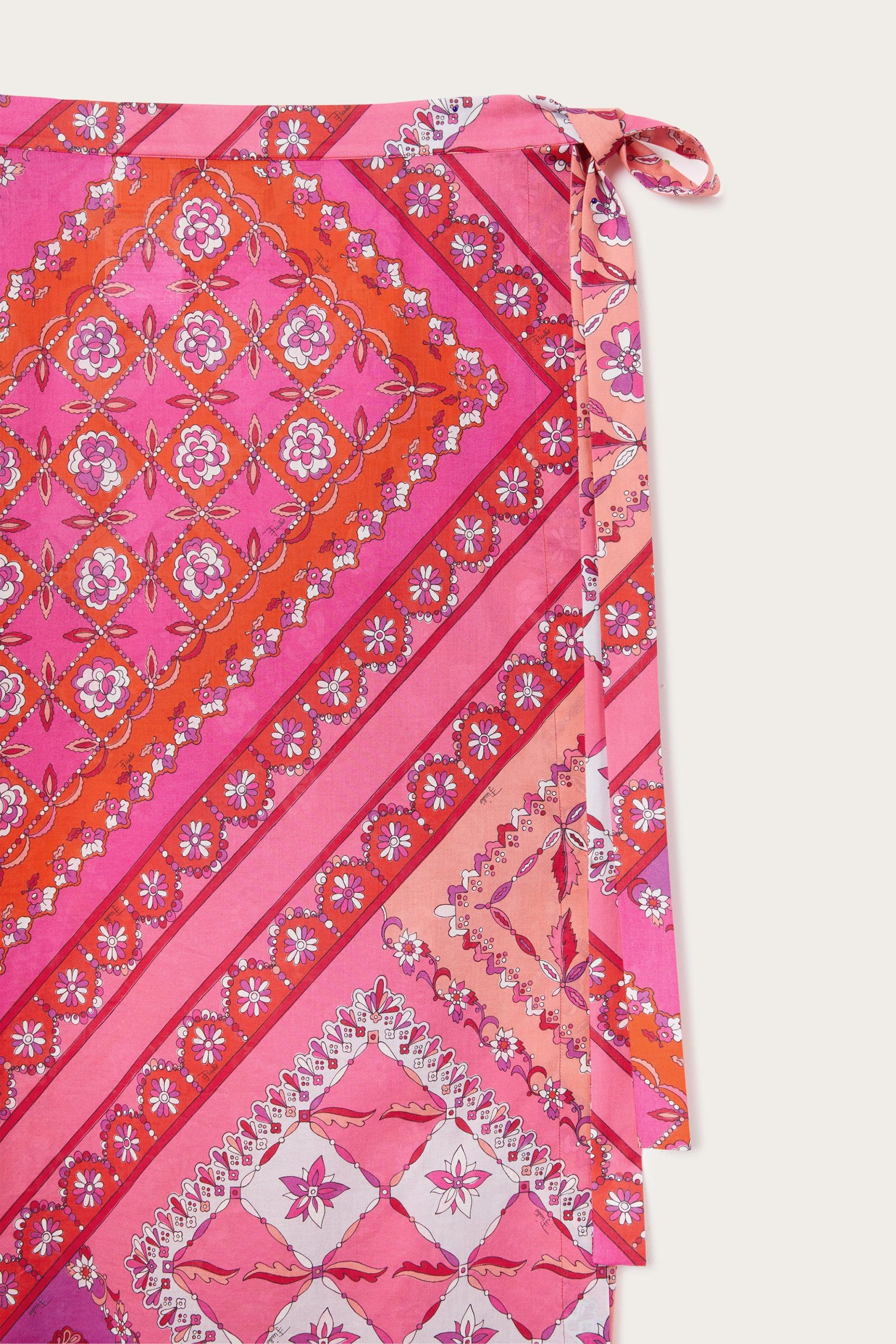 An elegant and versatile garment, perfect for enhancing the silhouette with a light touch. This long sarong to tie at the waist features a straight cut that accompanies movements with fluidity, while the slit along the leg gives dynamism and femininity.Made of 100% cotton, it is cool and comfortable, ideal for warmer days. The Festa print in coral and fuchsia adds a refined and vibrant accent, enhancing the design with its harmonious composition of stylized flowers.