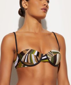 A bikini bra designed to give you the perfect mix of support and style. With its balconette design, this garment gracefully enhances your silhouette, while the round details on the straps add an original and feminine touch. Made of stretch lycra with anti-UV treatment, it is ideal for protecting you from the sun’s rays while maintaining a comfortable and adaptable fit. The Iride Baby print in shades of khaki gives it a bold and refined character, perfect for pairing with your relaxing moments at the beach or pool…and the matching brief.
