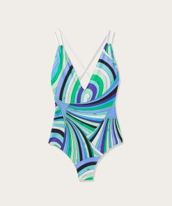 Essential elegance and refined details meet in this one-piece swimsuit with a slinky design. The deep V-neckline enhances the silhouette with a sophisticated touch, while the double thin straps add lightness and femininity to the look. Made of stretch lycra with anti-UV treatment, it provides a snug fit and sun protection, combining comfort and performance. The Iride print in shades of green and lilac brightens the design with a vibrant and dynamic color mix, perfect for those who love the distinctive appeal of Pucci style.