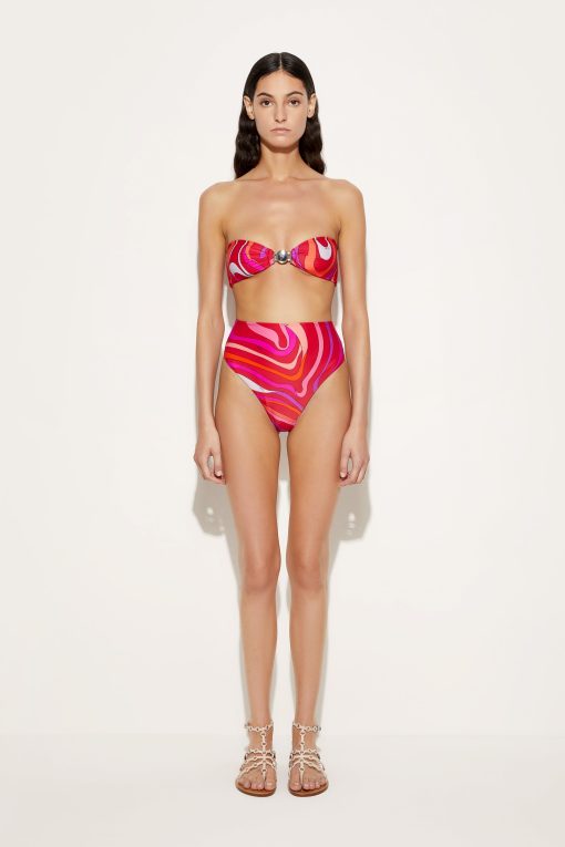 A perfect beach wardrobe ally, this strapless bikini top captivates with its sleek and versatile design. The knotted effect in the center enhances the neckline with a feminine touch, while the stretch Lycra fabric with UV treatment ensures you comfort and protection under the sun. The Marmo print in coral and fuchsia adds a hint of character, ideal for those who like to stand out at all times. Pair it with the coordinating high-waisted bikini bottom for a flawless look or mix and match with other pieces for a unique, customized beach outfit.