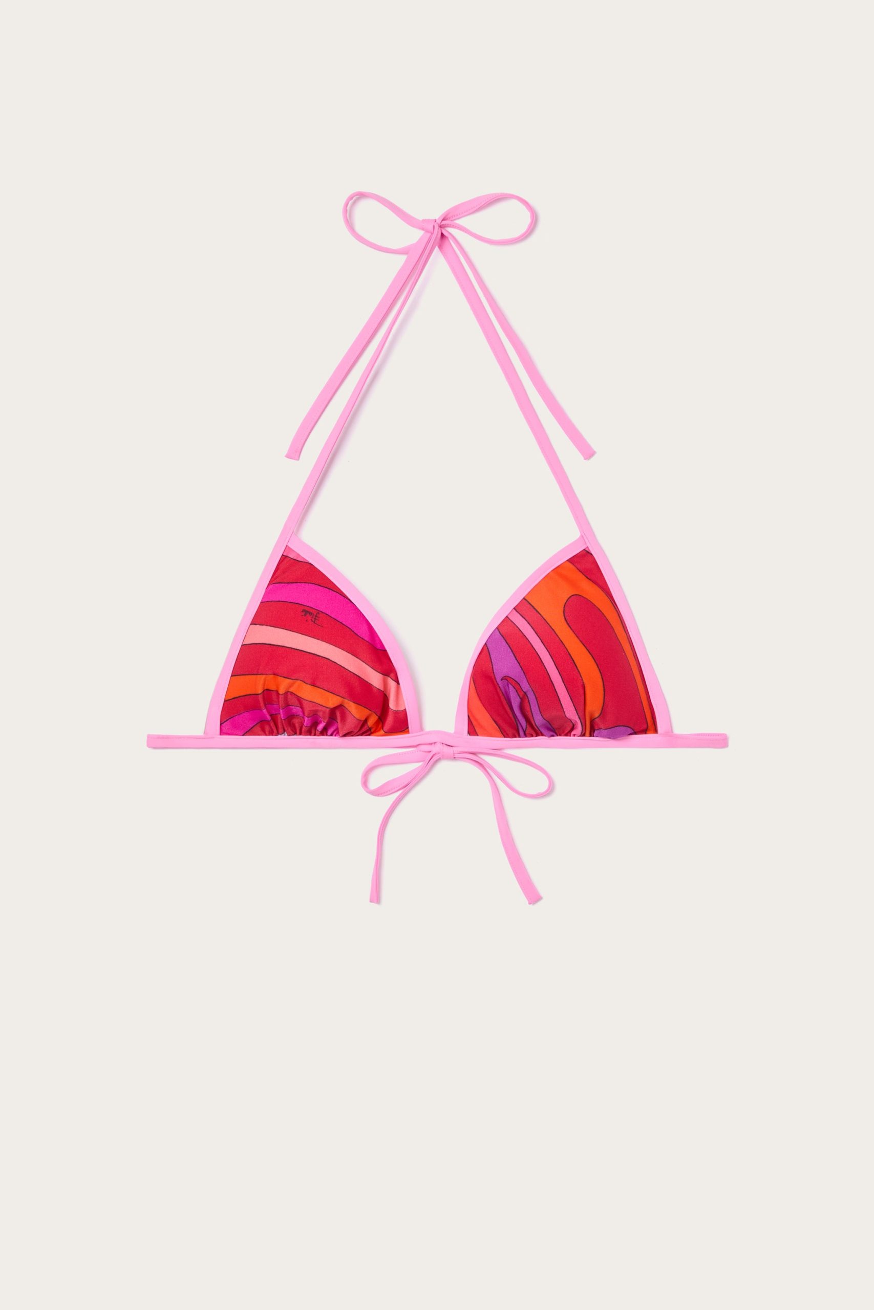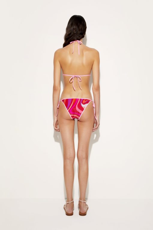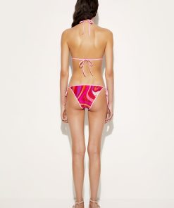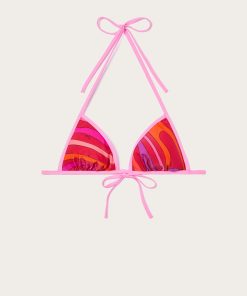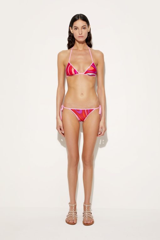 A classic that never goes out of style, perfect to accompany you during your days in the sun: the triangle bikini bra, with its removable cups, offers the right combination of support and comfort. Stretchy lycra, enriched with anti-UV treatment, protects you while you enjoy the sea or the pool, without ever sacrificing style. The Marmo print in coral and fuchsia tones adds a lively and fun touch, making it easy to pair with matching briefs or mix&match to create your own unique look. A must-have for those who like to stand out even at the beach, with Pucci’s unmistakable vibrancy.