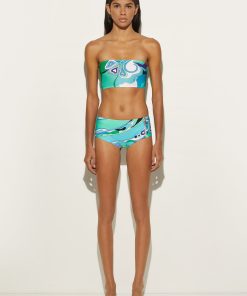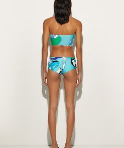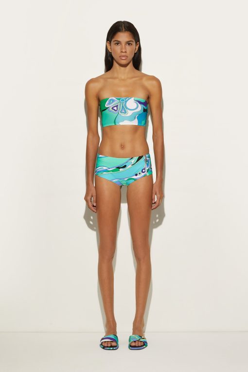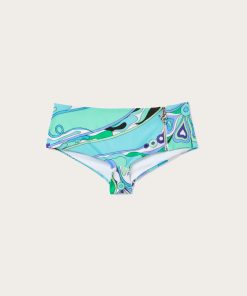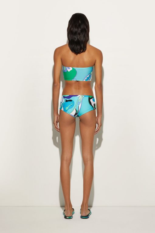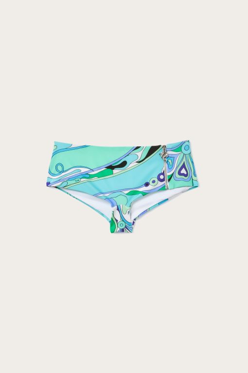 If you are looking for a bikini that combines comfort and style, this microshort style bottom is the perfect choice. With its midrise fit and opaque cut, it enhances the silhouette while offering support and freedom of movement. It is the ideal ally for sunny days, thanks to the stretchy Lycra with anti-UV treatment, which protects the skin without sacrificing softness. The real touch of character? The Orchidee print in green and lilac, an icon of the brand that makes this garment unique and distinctive. Wear it with the matching top for a total Pucci look.