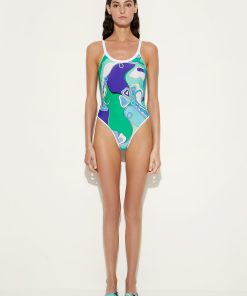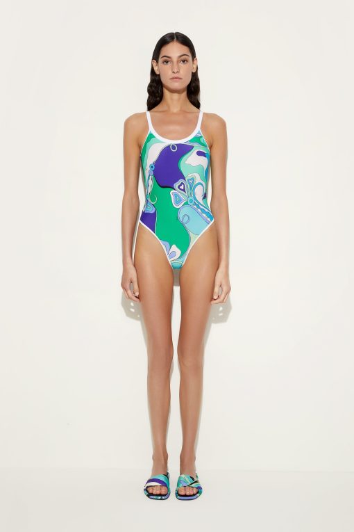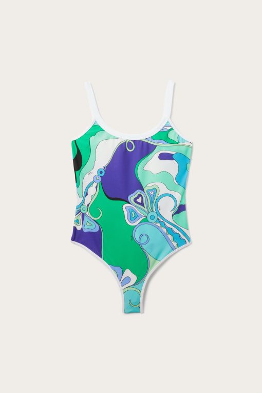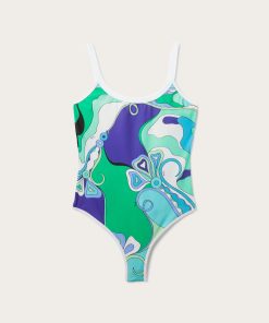 Elegance and comfort meet in this one-piece swimsuit, featuring a delicate neckline and thin straps that enhance the silhouette with sophistication. A garment designed for those who want a sophisticated look even at the seaside, combining style and functionality. Made of stretch lycra with anti-UV treatment, it ensures a flawless fit and protection from the sun’s rays. The Orchidee print in shades of green and lilac gives a touch of freshness and movement to the design, making it an iconic piece of the Pucci collection.