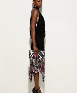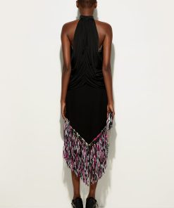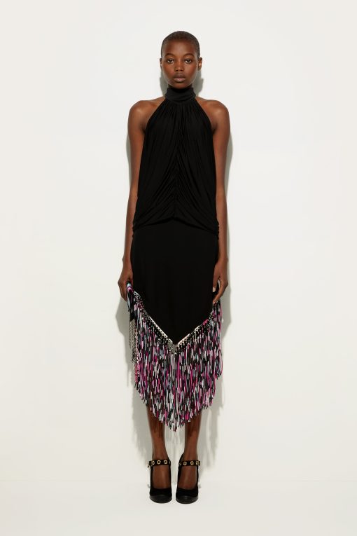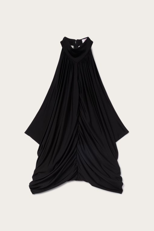 Essential lines and fluid draping meet in this sensual top, a garment that plays with the movement and softness of the fabric. The high neck adds a touch of sophistication, while the wide draped side openings lend lightness and dynamism to the silhouette. Made of lightweight viscose knit, it hugs the figure with an ultra-soft-to-the-touch finish, offering a comfortable and sophisticated fit. The black color enhances its versatility, making it a perfect garment for any occasion.