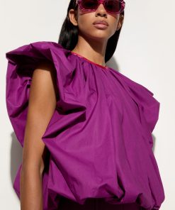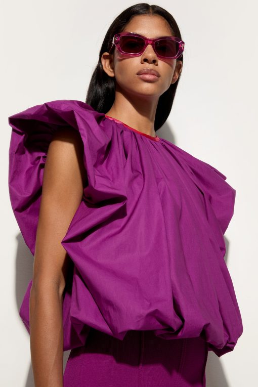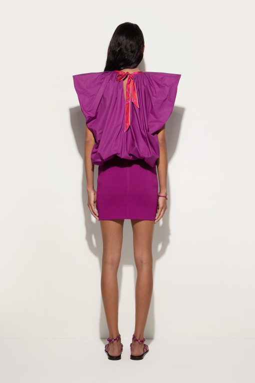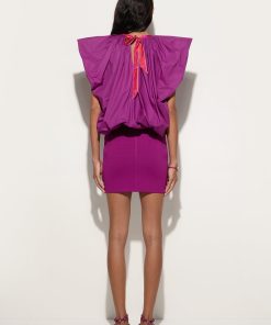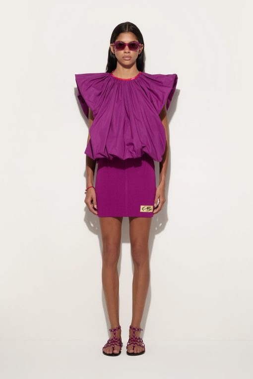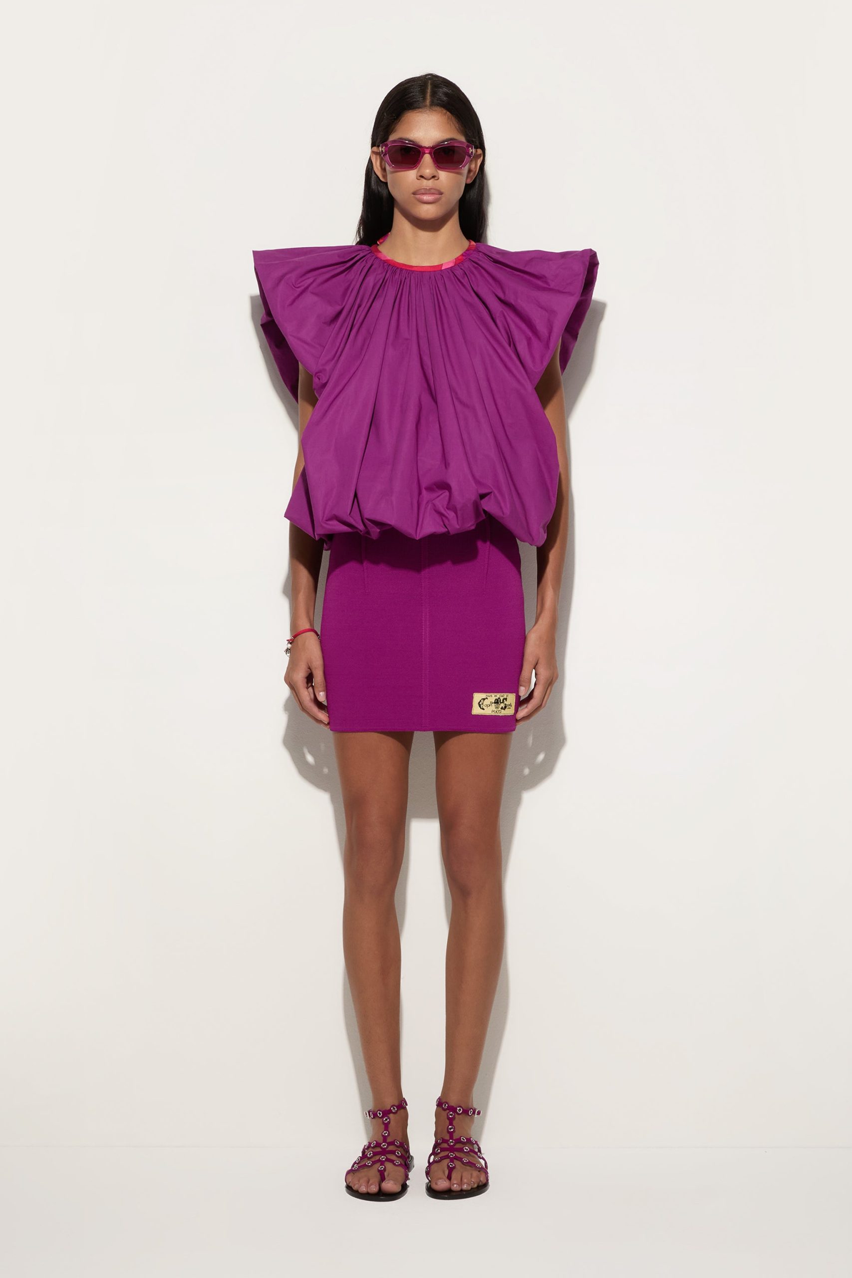 A top that celebrates lightness and femininity with a refined, modern design. Featuring a loose silhouette and ruffles along the hem, this sleeveless piece is perfect for adding movement and freshness to your looks. The round neckline and tie at the back of the neck add a touch of understated elegance, ideal for both casual and sophisticated outfits. Embellished with printed silk profiles, which give a colorful and sophisticated accent, it is the perfect garment to face the summer season with style and comfort.