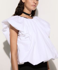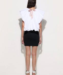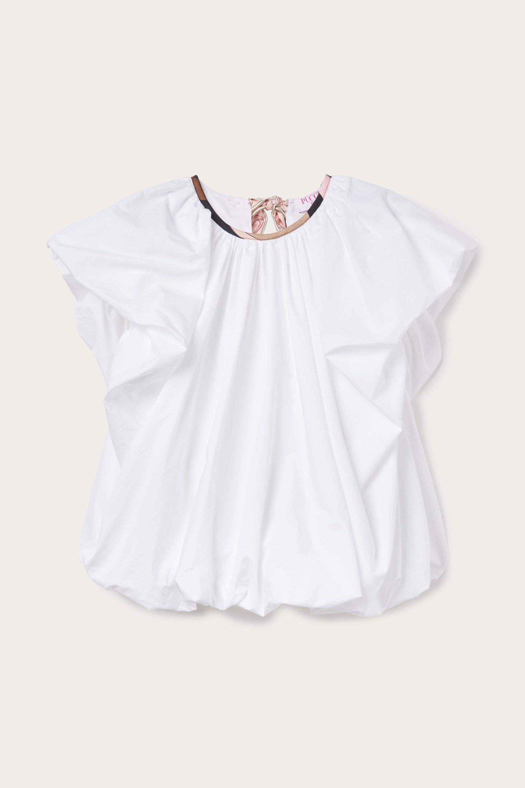 A top that celebrates lightness and femininity with a refined, modern design. Featuring a loose silhouette and ruffles along the hem, this sleeveless piece is perfect for adding movement and freshness to your looks. The round neckline and tie at the back of the neck add a touch of understated elegance, ideal for both casual and sophisticated outfits. Embellished with printed silk profiles, which give a colorful and sophisticated accent, it is the perfect garment to face the summer season with style and comfort.